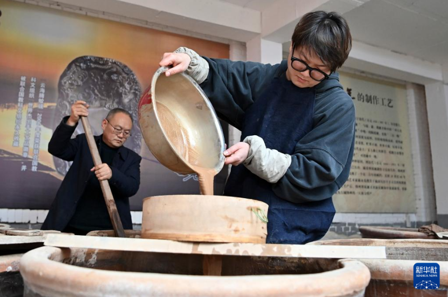 在山西省新絳縣光村絳州澄泥硯生產(chǎn)基地,藺霄麟(右)和父親藺濤在澄清過濾泥土(2023年2月14日攝)。