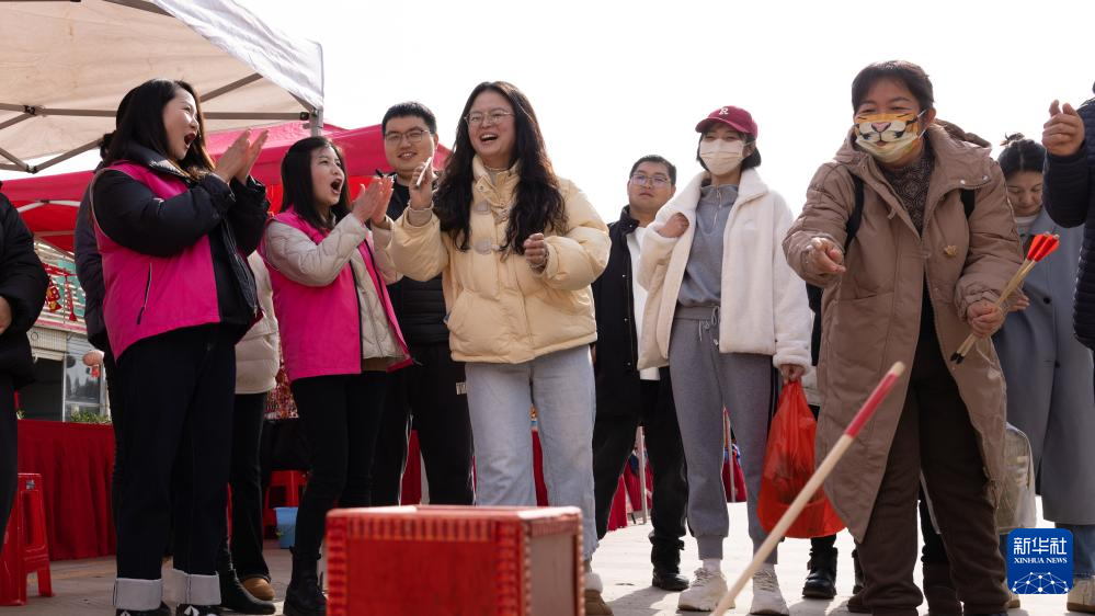 1月27日,市民在斗南年貨集市玩投壺游戲。