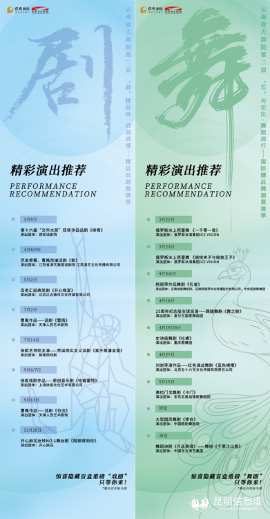 與音樂會(huì)一同舉辦的還有云南省大劇院新一年《“劇”精會(huì)神·戲劇潤(rùn)情——精品戲劇展演季》的演出一覽。2024年的戲劇季依舊精彩不斷,有包括天津人民藝術(shù)劇院打造的曹禺名作改編話劇《雷雨》《日出》等在內(nèi)的8部舞臺(tái)“實(shí)力派”戲劇經(jīng)典佳作匯集,讓古今中外的文學(xué)經(jīng)典躍然于舞臺(tái)之上。