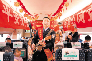 列車新春聯(lián)歡會(huì)在乘警的新春祝福中拉開(kāi)序幕。在乘警演唱《明天會(huì)更好》的歌聲中,車廂內(nèi)熱鬧起來(lái),旅客們跟著旋律打起節(jié)拍、唱起歌;“00”后乘警蘇鈺舒精心準(zhǔn)備的琵琶獨(dú)奏《China-E》《春節(jié)序曲》給旅客帶來(lái)全新的體驗(yàn),旅客們紛紛拿起手機(jī),記錄精彩瞬間;乘警李洪銳用葫蘆絲吹起《竹樓情歌》,在歡快的節(jié)奏中,旅客們興致高漲,積極加入聯(lián)歡互動(dòng)……