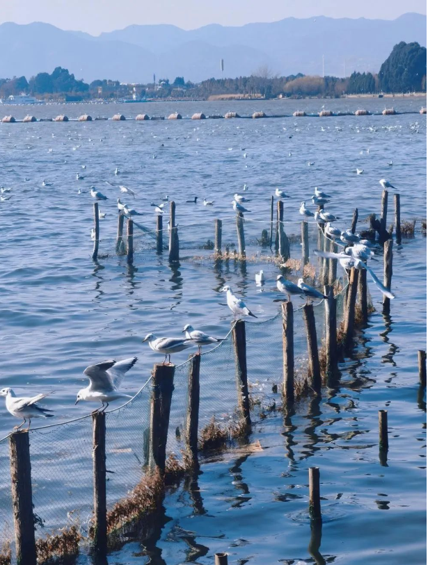 海洪濕地公園位于昆明市西山區(qū)滇池旁,無需門票,這里擁有豐富的水生植物和鳥類資源,是觀鳥愛好者和攝影愛好者的好去處。藏在昆明的水上森林,帶你進入冬日童話。夕陽西下,濕地多個觀景臺上,熱情的人們拋撒著鷗糧,享受著喂鷗之樂。