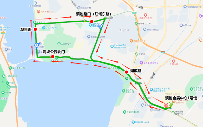 途經站點:滇池會展中心1號館(起始站)、湖濱路、海埂公園北門、觀景路、滇池路口(紅塔東路);