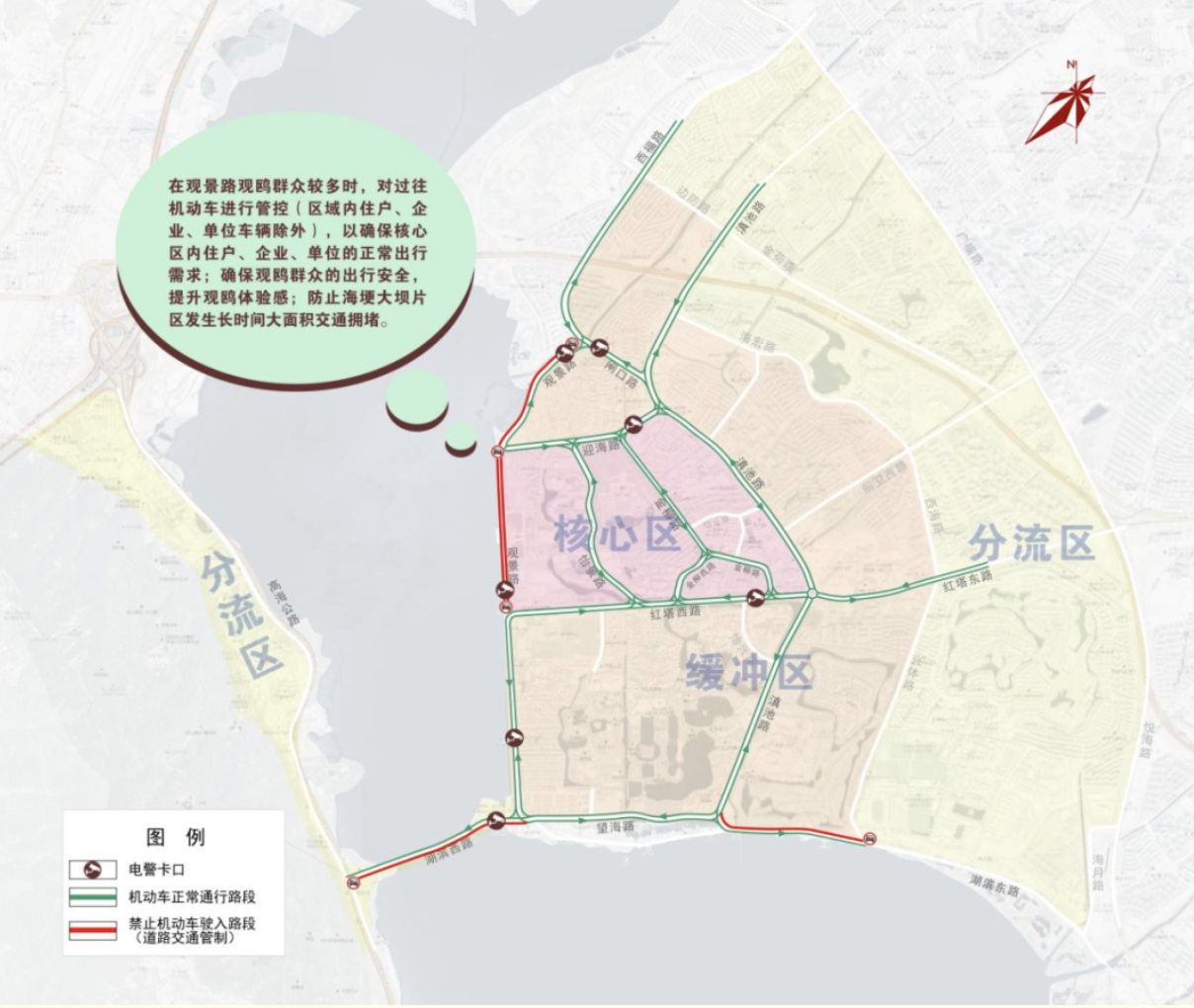 為緩解海埂大壩周邊觀鷗景區(qū)交通擁堵,保障周邊住戶、企業(yè)、單位正常出行需求,確保觀鷗群眾出行安全,提升市民、游客觀鷗體驗,每年11月至次年3月觀鷗季期間,昆明公安交警根據(jù)觀鷗人車流量聚集情況將海埂大壩片區(qū)分為核心區(qū)、緩沖區(qū)和分流區(qū),對周六、周日及法定節(jié)假日等觀鷗高峰時段采取分流管控措施,具體如下: