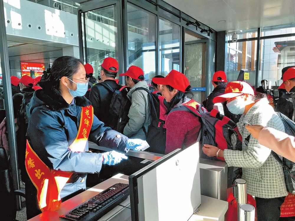 2月17日一大早,威信縣1112名外出務(wù)工人員陸續(xù)來到威信縣高鐵站。在工作人員和志愿者引導(dǎo)下,有序通過閘機,進站、安檢,搭乘“點對點”定制高鐵,分赴上海、浙江、廣東等地務(wù)工。
