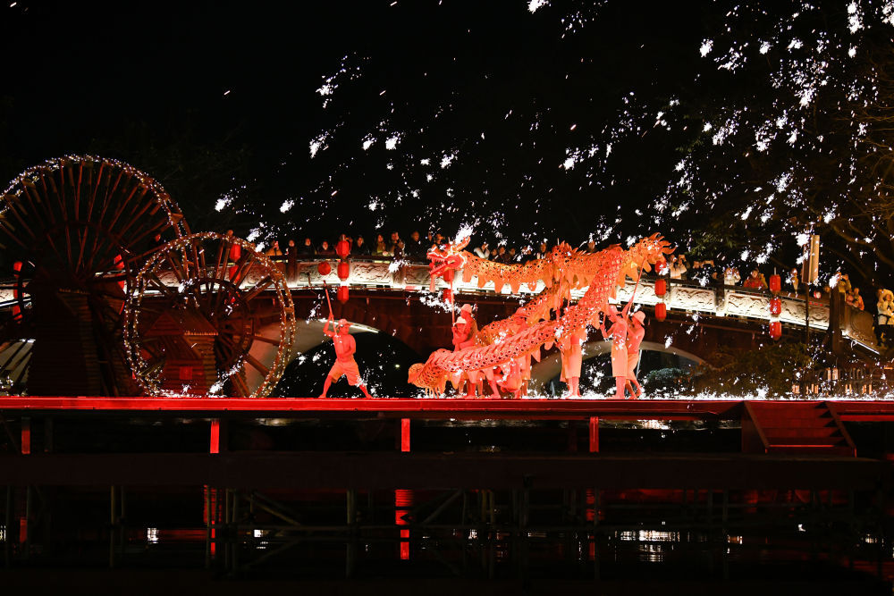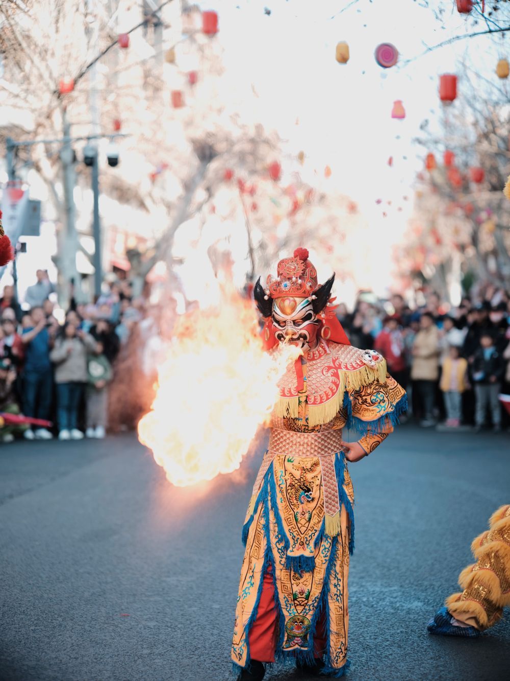 別樣的傳統(tǒng)非遺項目演出同樣在春節(jié)期間大放異彩。在成都雙流區(qū)黃龍溪鎮(zhèn),從初一至初八,這里每晚都會上演“燒火龍”表演。約1500攝氏度的鐵汁被擊打成10多米高的鐵花,舞龍者赤膊上陣,一條金黃的“火龍”穿梭其中,當(dāng)萬千鐵花盡情綻放的一剎那,來自五湖四海的人們抬頭仰望流光溢彩的夜空,在璀璨的光芒中許下美好愿望,充滿煙火氣的別樣年味兒隨之蔓延。
