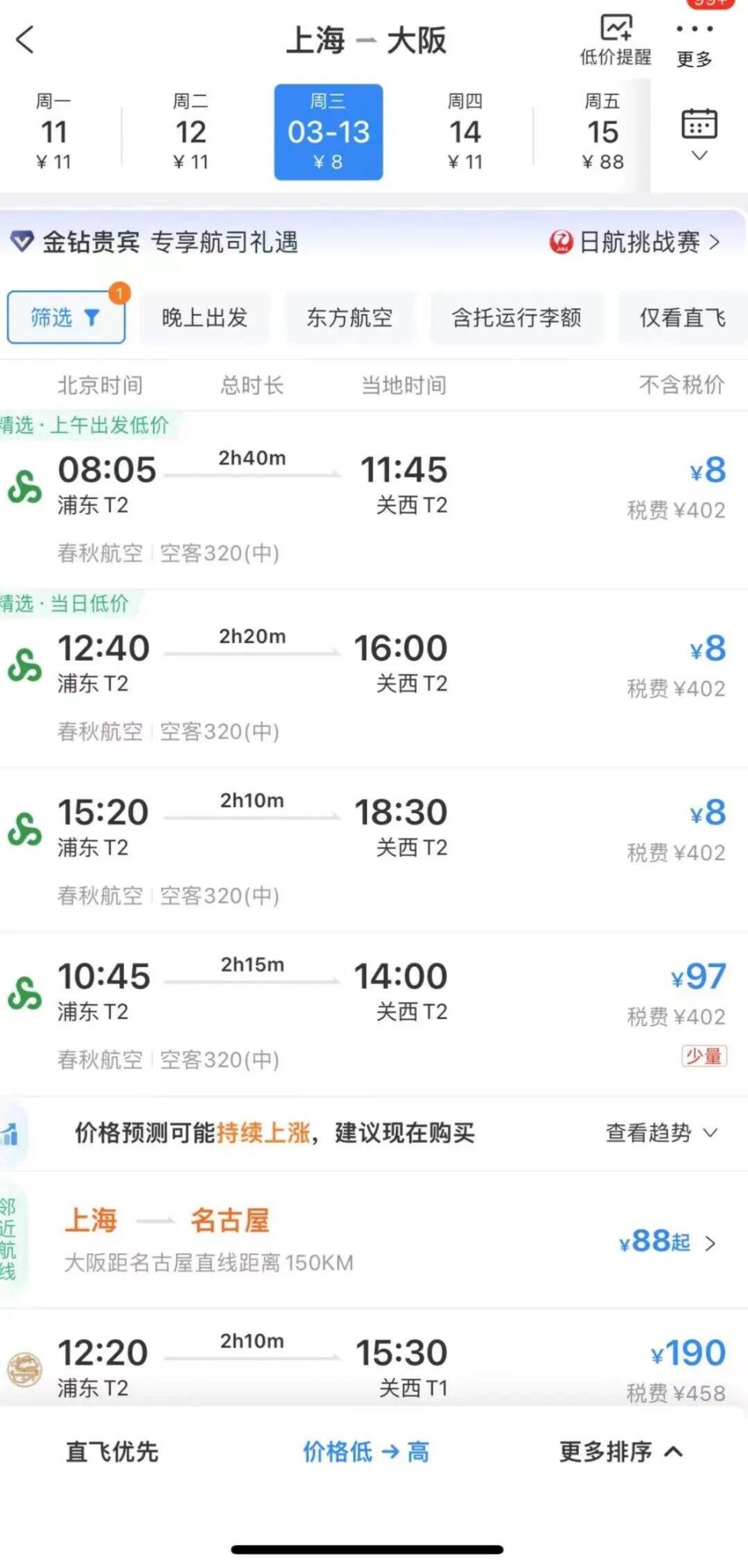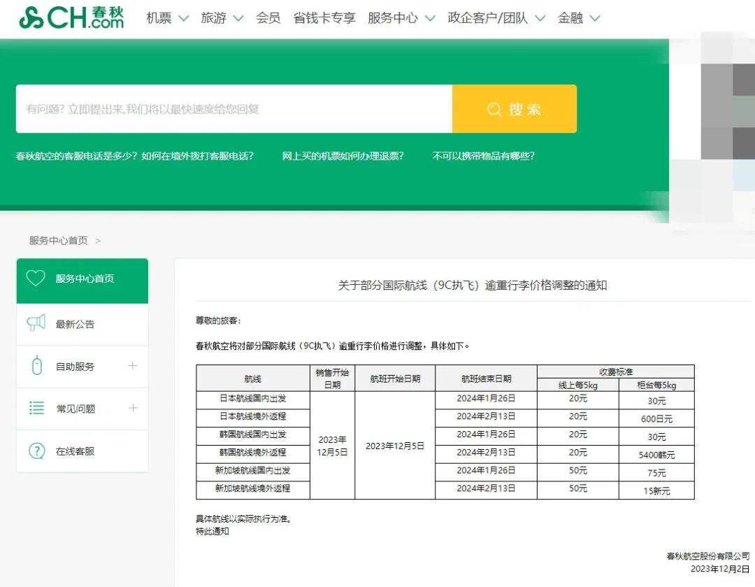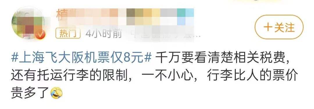 仔細(xì)一看,8到11元再加上稅費(fèi)的票價來自春秋航空公司,購買這家航空公司的機(jī)票需要注意諸多方面,其中一點(diǎn)就是不可以免費(fèi)托運(yùn)行李,如果有托運(yùn)需求大約每公斤75元。