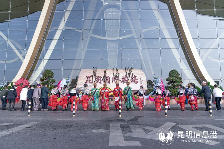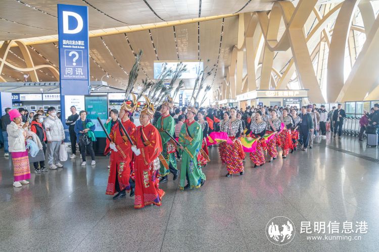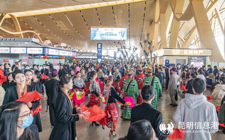 昆明信息港訊 記者上官艷君 2月22日,以“斑色花開迎新年,目瑙縱歌慶盛世”為主題的目瑙縱歌展演活動(dòng)在昆明長水國際機(jī)場(chǎng)航站樓出發(fā)大廳歡樂上演。
