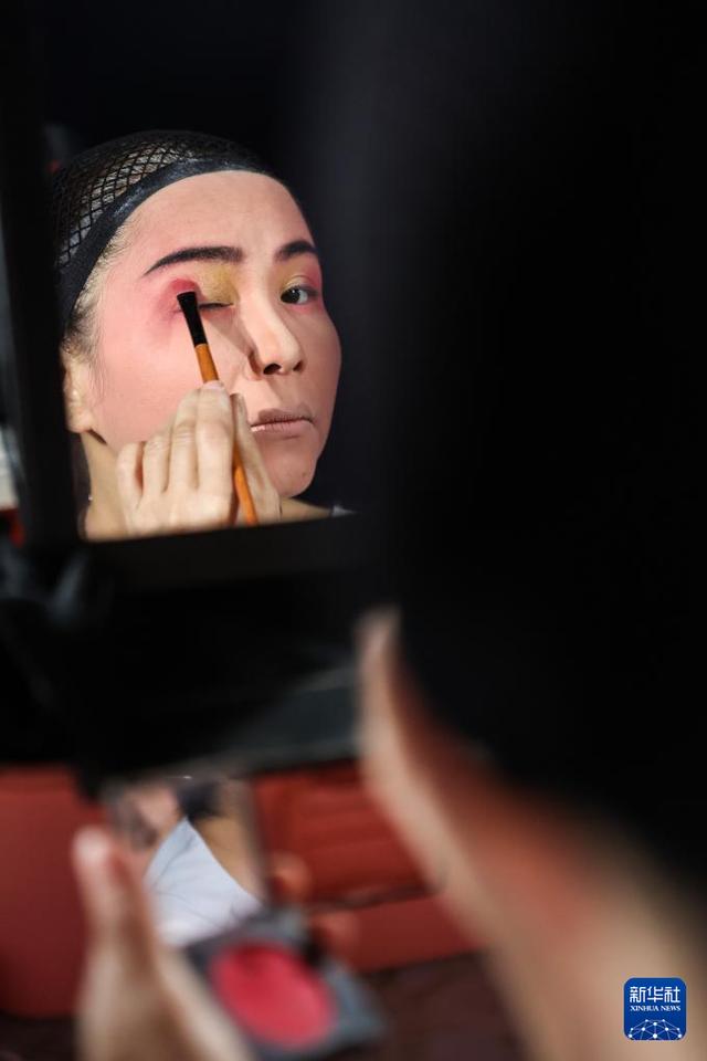 2月21日,海南定安縣瓊劇團(tuán)的演員在定安縣后山村演出前化妝。