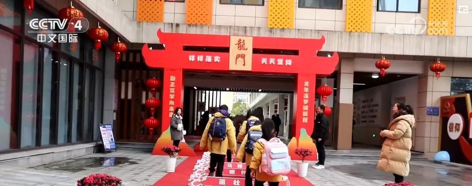 在浙江衢州市一所小學(xué),老師們舉行舞龍和跨龍門活動(dòng)迎接學(xué)生到來。孩子們歡呼雀躍著跨過一道道寫滿祝福的龍門,進(jìn)入教室。