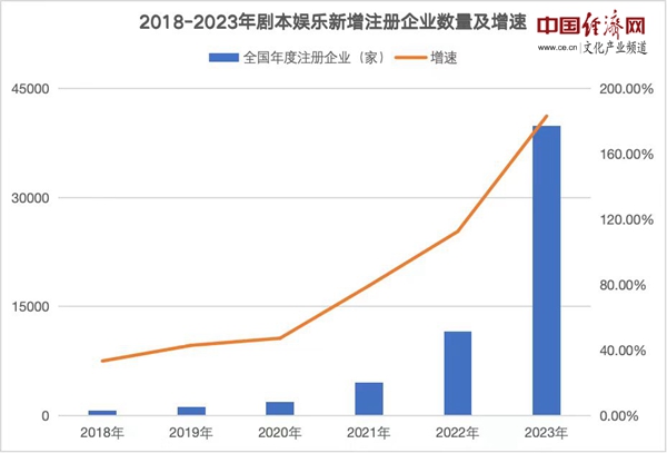我國(guó)劇本娛樂行業(yè)起源于2012年前后,2016年興起,并迎來飛速發(fā)展,2018至2022年,劇本娛樂經(jīng)營(yíng)場(chǎng)所總體數(shù)量增長(zhǎng)幅度超過400%。天眼查數(shù)據(jù)顯示,截至目前,現(xiàn)存劇本娛樂相關(guān)企業(yè)5.2萬余家;其中,2023年1-12月,新增注冊(cè)相關(guān)企業(yè)3.5萬余家,與2022年同比增加222.7%。