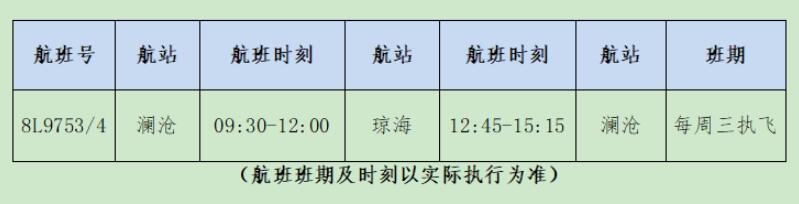 據(jù)了解,祥鵬航空瀾滄?瓊海航線,由空客A320機(jī)型執(zhí)飛,每周三執(zhí)行一班;去程航班8L9753,09:30從瀾滄景邁機(jī)場(chǎng)起飛,12:00抵達(dá)瓊海博鰲機(jī)場(chǎng);回程航班8L9754,12:45從瓊海博鰲機(jī)場(chǎng)起飛,15:15抵達(dá)瀾滄景邁機(jī)場(chǎng)。