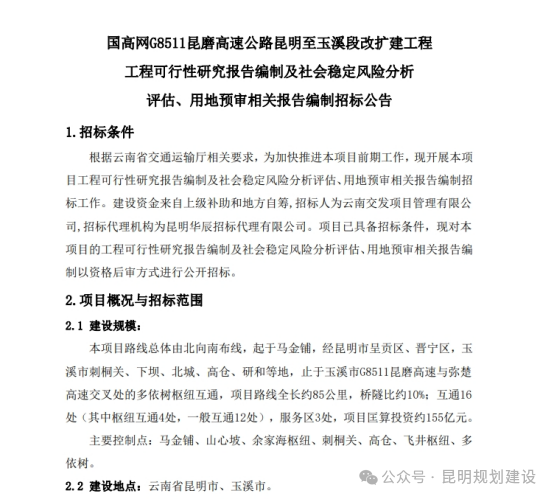 近日,云南省公共資源交易中心發(fā)布“國高網(wǎng)G8511昆磨高速公路昆明至玉溪段改擴建工程”工程可行性研究報告編制及社會穩(wěn)定風險分析評估、用地預審相關報告編制招標公告。