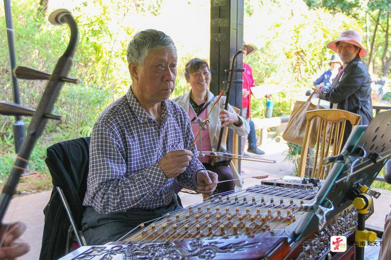 彌勒寺公園的游人覆蓋到了全年齡段,涼亭里人們演奏民樂(lè)