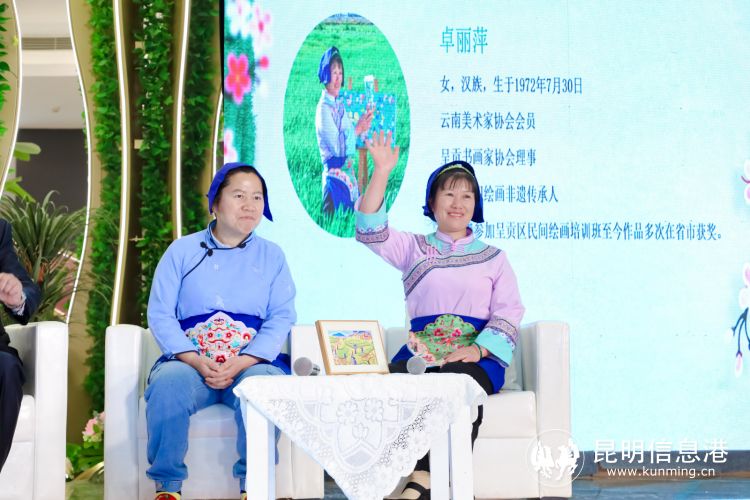 呈貢區(qū)民間繪畫非遺傳承人卓麗萍、羅麗珍現(xiàn)場介紹自己的創(chuàng)作故事