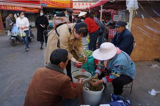 倘若不能親自采摘又饞春日的美味,農(nóng)貿(mào)市場(chǎng)自是值得一逛。在北門菜市場(chǎng)農(nóng)作物自產(chǎn)自銷區(qū),隨處可見已經(jīng)焯水的棠梨花,不時(shí)有人上前詢價(jià)購(gòu)買。劉雪英是餐飲店老板,近期她每天都要購(gòu)買大量的棠梨花:“顧客非常喜歡,我今天早上又買了10多公斤,8塊錢一公斤,純天然的、味道鮮美?!?/p>