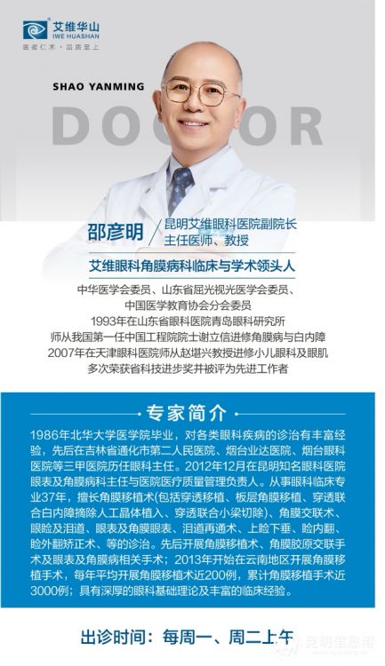 邵彥明院長從事眼科臨床專業(yè)37年,擅長角膜移植術(shù)、角膜交聯(lián)術(shù)、眼瞼及淚道、角膜眼表、小兒視光等的診治。2013年開始在云南地區(qū)開展角膜移植手術(shù),每年平均開展角膜移植術(shù)近200例,累計(jì)角膜移植手術(shù)近3000例,具有深厚的眼科基礎(chǔ)理論及豐富的臨床經(jīng)驗(yàn)。邵彥明院長來臨滄艾維眼科醫(yī)院坐診,醫(yī)院提前通知了角膜疾病以及兒童視光問題的患者,不少患者及家屬慕名而來。