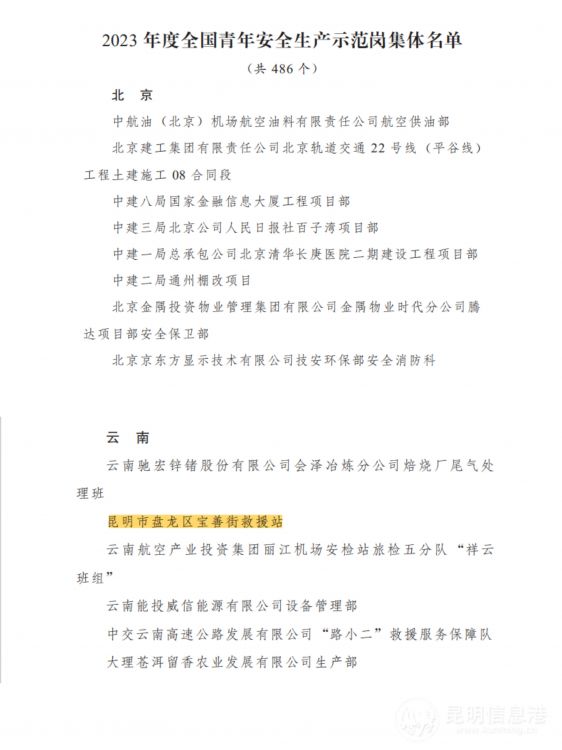 昆明信息港訊 記者勞學(xué)麗 近日,共青團中央、應(yīng)急管理部聯(lián)合下發(fā)通知,認(rèn)定全國486個集體為2023年度全國青年安全生產(chǎn)示范崗。其中,昆明市盤龍區(qū)寶善街消防救援站光榮上榜,被評為2023年度全國青年安全生產(chǎn)示范崗,是云南獲評的6個集體之一。
