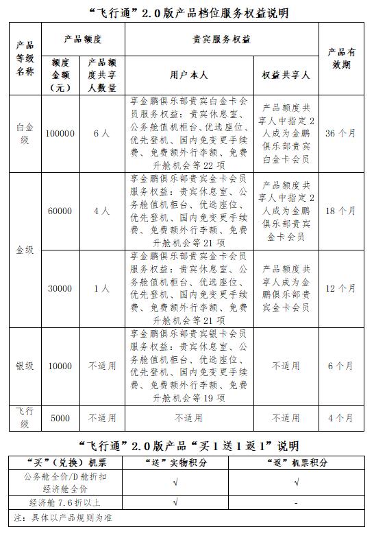 此次升級后,購買“飛行通”2.0版白金級、金級、銀級產(chǎn)品的旅客將同步尊享金鵬俱樂部白金卡、金卡、銀卡的貴賓服務(wù)權(quán)益,包括貴賓休息室、公務(wù)艙值機柜臺、優(yōu)先登機、免費額外行李額、免費升艙機會等20余項VIP專屬禮遇,全方位滿足旅客的出行需求。