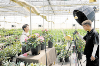 大學(xué)生在種植基地直播賣花。