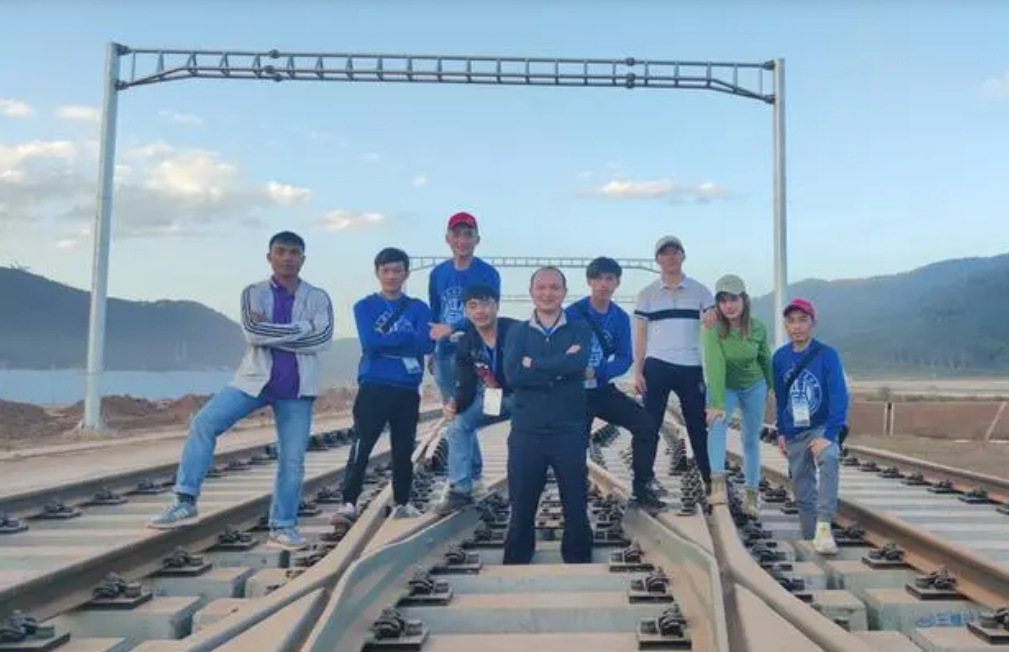 老撾留學(xué)生與中國老師在中老鐵路考察實(shí)習(xí)。