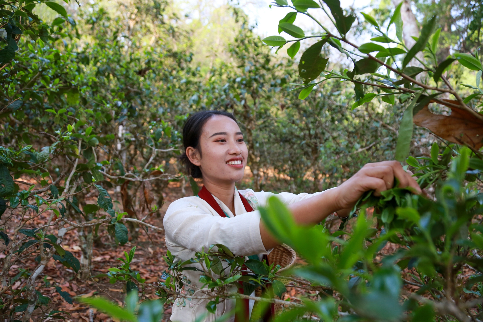 站在茶林里,清晨斑駁的陽(yáng)光透過(guò)高大的青樹(shù)灑進(jìn)茶林,在不同高度層巧妙分配光照和養(yǎng)分,各種植物的芬芳,相互交融,沁入茶葉。