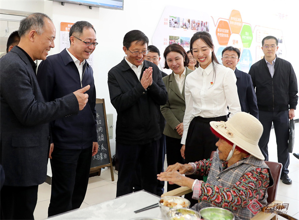 王予波、于學(xué)軍一行在栗子園健康社區(qū)幸福食堂與老年居民現(xiàn)場(chǎng)交流。記者 黃興能 攝