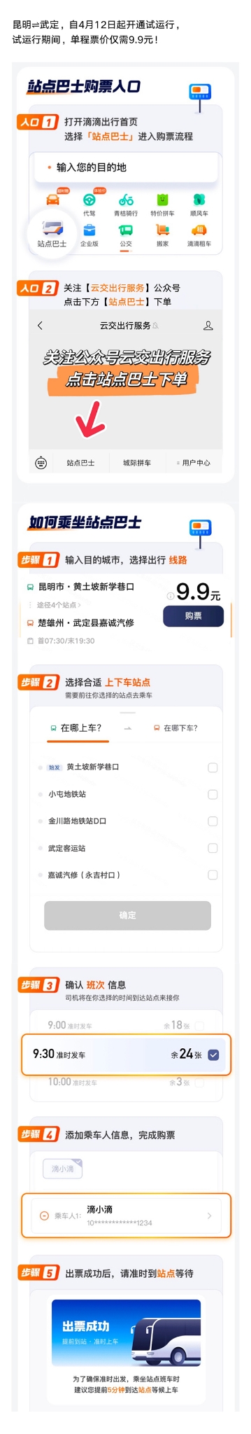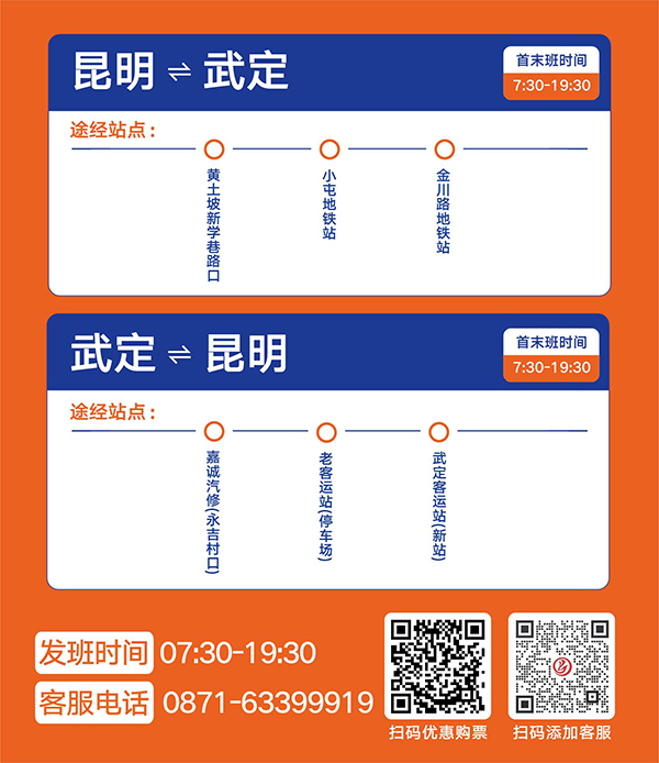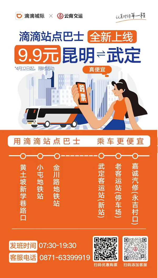 據(jù)悉,該線路由昆明交通運輸集團有限公司承運,攜手滴滴出行線上平臺,開行初期限時優(yōu)惠價9.9元。沿途??奎c有昆明端設(shè)立黃土坡立交橋新學巷口、小屯地鐵口、金川路地鐵口三個站點,武定端設(shè)立嘉誠汽車修理廠、武定汽車運輸公司、武定順安客運站三個站點,將最大限度為沿線乘客提供便乘服務(wù)。運營初期,投入8輛符合國家標準的營運車輛,首末班時間為7:30—19:30,約30-45分鐘每班。并將根據(jù)乘客反饋適時調(diào)整運力及發(fā)班時間。