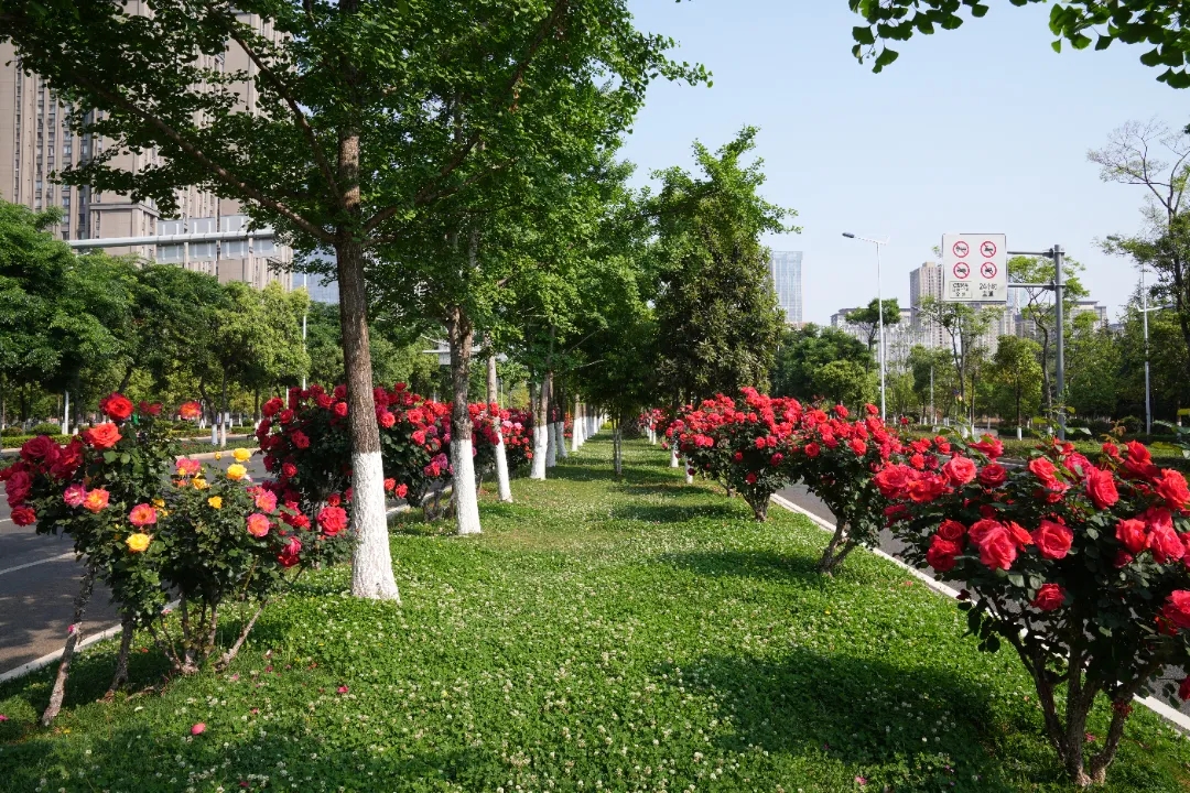 紅的如火、粉的似霞、黃的似金、白的像雪,各色月季在陽光下熱烈盛開,將整座城市裝點得如詩如畫,宛如一幅生動的油畫,美得讓人移不開眼。