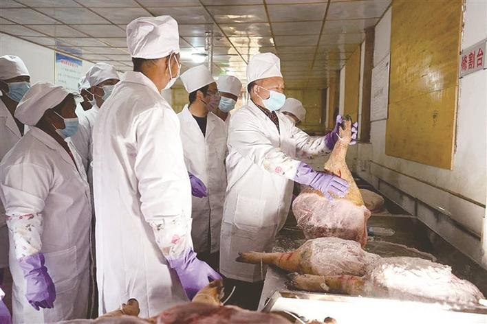 楊伍松(右一)在火腿廠內(nèi)指導職工腌制火腿。(資料照片)