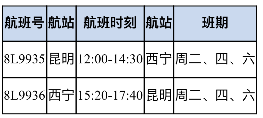 據(jù)悉,祥鵬航空昆明?西寧航班計劃每周二、四、六執(zhí)飛。去程航班號8L9935,計劃12:00從昆明長水國際機場起飛,14:30到達西寧曹家堡機場?;爻毯桨嗵?L9936,計劃15:20從西寧曹家堡機場起飛,17:40到達昆明長水國際機場。