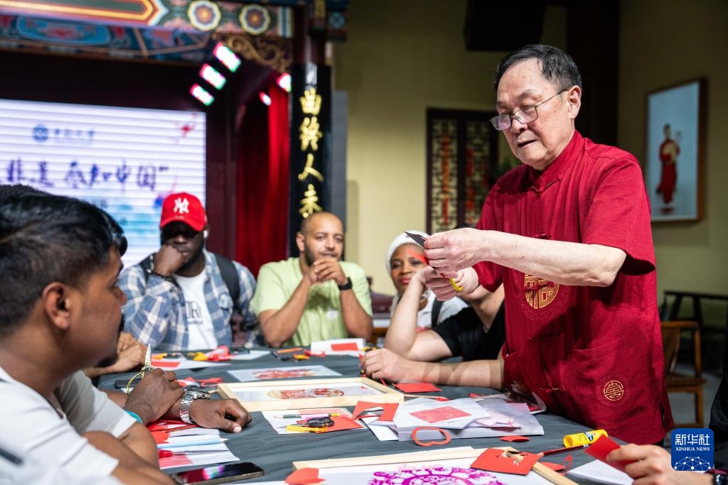4月18日,在長沙非物質(zhì)文化遺產(chǎn)館,非遺傳承人(右一)為留學(xué)生介紹剪紙技藝。新華社記者 陳思汗 攝