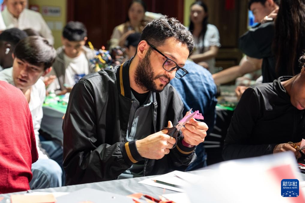 4月18日,在長沙非物質(zhì)文化遺產(chǎn)館,留學(xué)生在體驗(yàn)剪紙。新華社記者 陳思汗 攝
