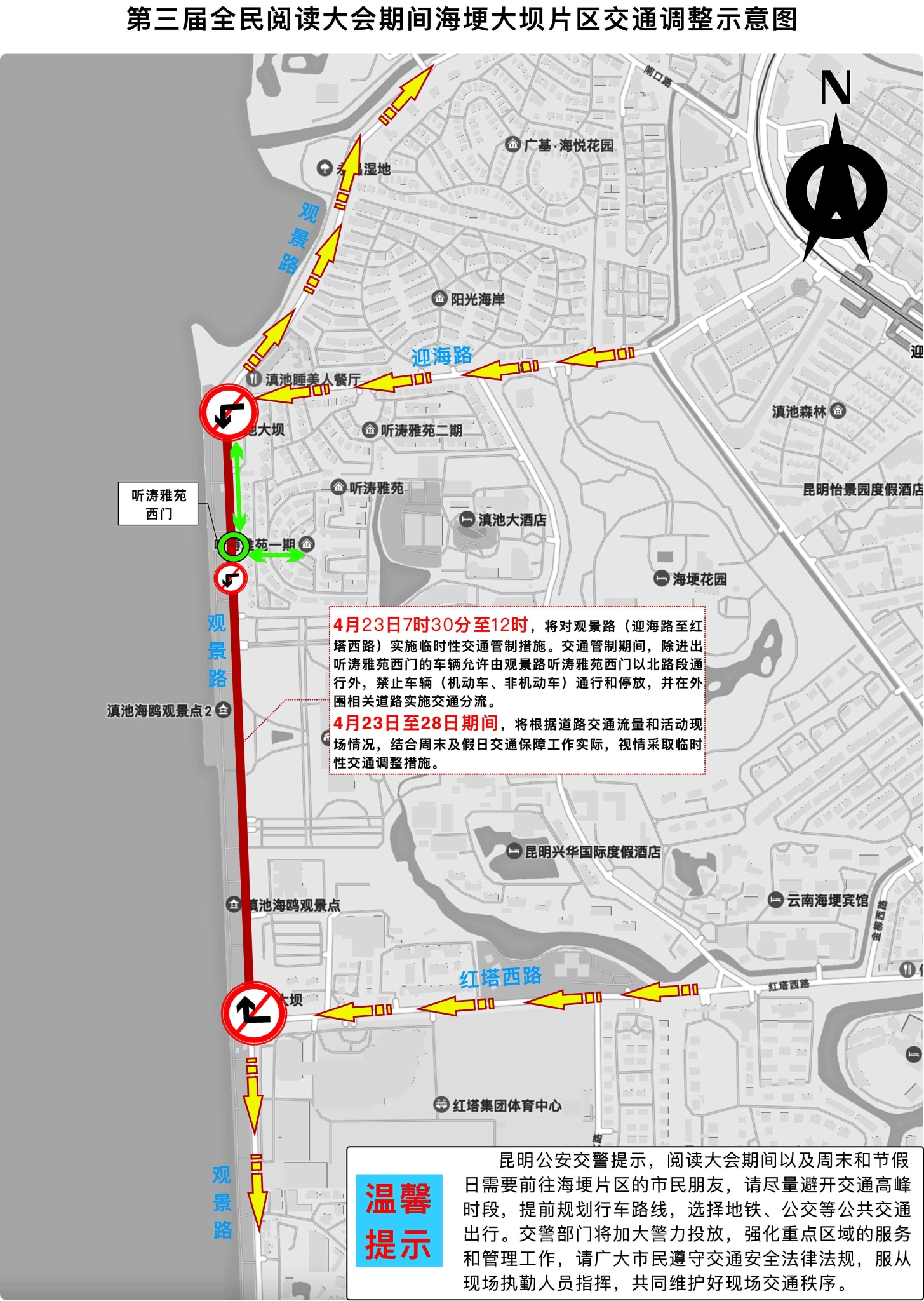 二、4月23日至25日期間,將根據(jù)道路交通流量和活動現(xiàn)場情況,對海埂大壩周邊的迎海路、觀景路、紅塔西路、怡景路、湖濱西路等道路,視情采取臨時性交通調(diào)整措施,并在外圍道路實施交通分流。