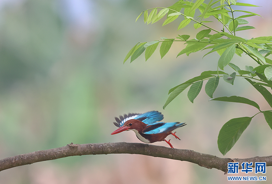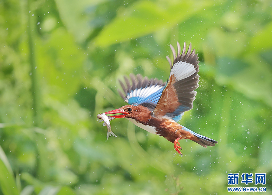 鸛嘴翡翠百發(fā)百中,叼魚急速起飛(4月15日攝)。新華網(wǎng)發(fā)(楊學飛攝)
