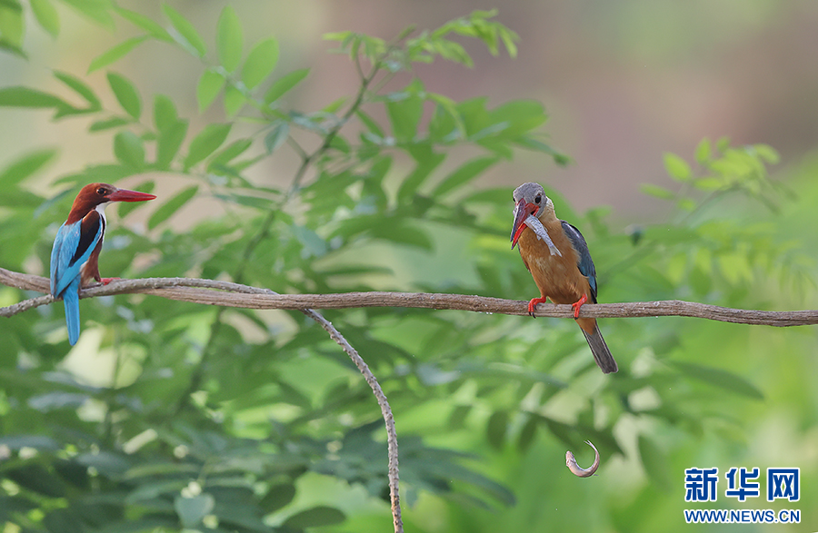 白胸翡翠叼著小魚去喂雌鳥(4月15日攝)。新華網(wǎng)發(fā)(楊學飛攝)