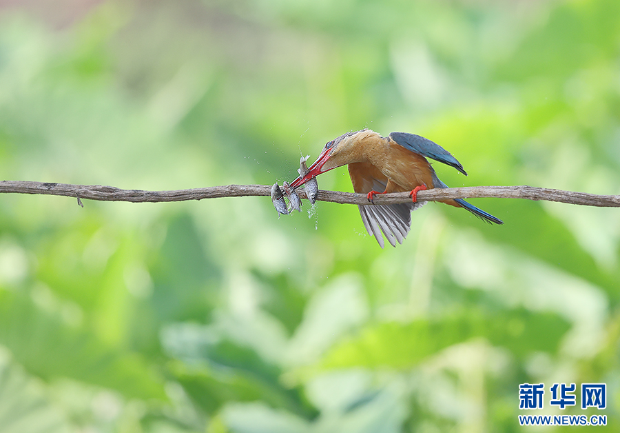 鸛嘴翡翠搖晃著頭把小魚在枝條上敲昏(4月15日攝)。新華網(wǎng)發(fā)(楊學飛攝)