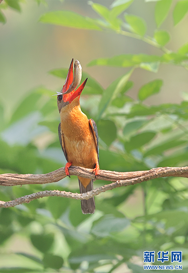 鸛嘴翡翠正在玩耍小魚(4月15日攝)。新華網(wǎng)發(fā)(楊學飛 攝)