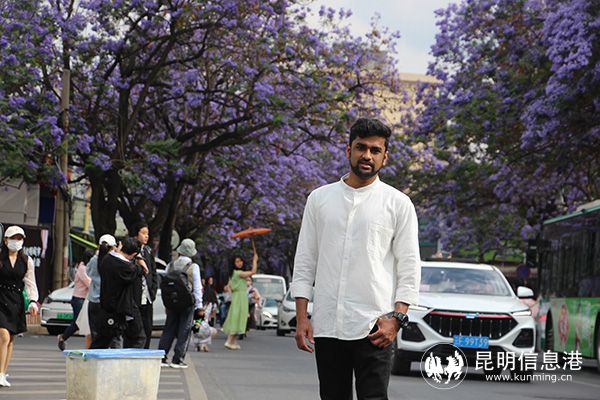 藍(lán)花楹盛開時節(jié),艾利福也和昆明市民一樣,喜歡到教場中路去看花。供圖