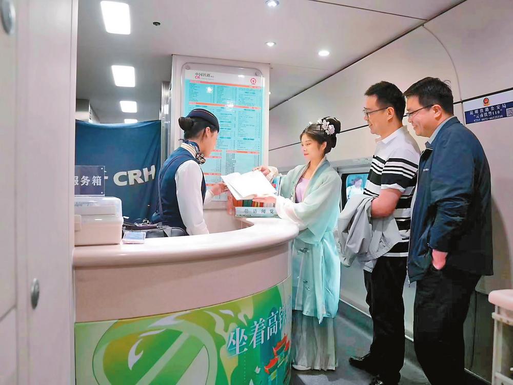 在全民閱讀大會(huì)期間,國(guó)鐵昆明局集團(tuán)把從北京、上海、磨憨等地至昆明的G401、G1371、C384等6趟列車設(shè)置為書香列車。在書香列車上,每節(jié)車廂都設(shè)置了書兜,餐車上還設(shè)置讀書角擺放優(yōu)秀圖書。同時(shí),書香列車上還開(kāi)展“書香鐵路行”系列活動(dòng),采取互動(dòng)閱讀、閱讀分享、閱讀接力打卡等形式吸引旅客參與全民閱讀活動(dòng)。