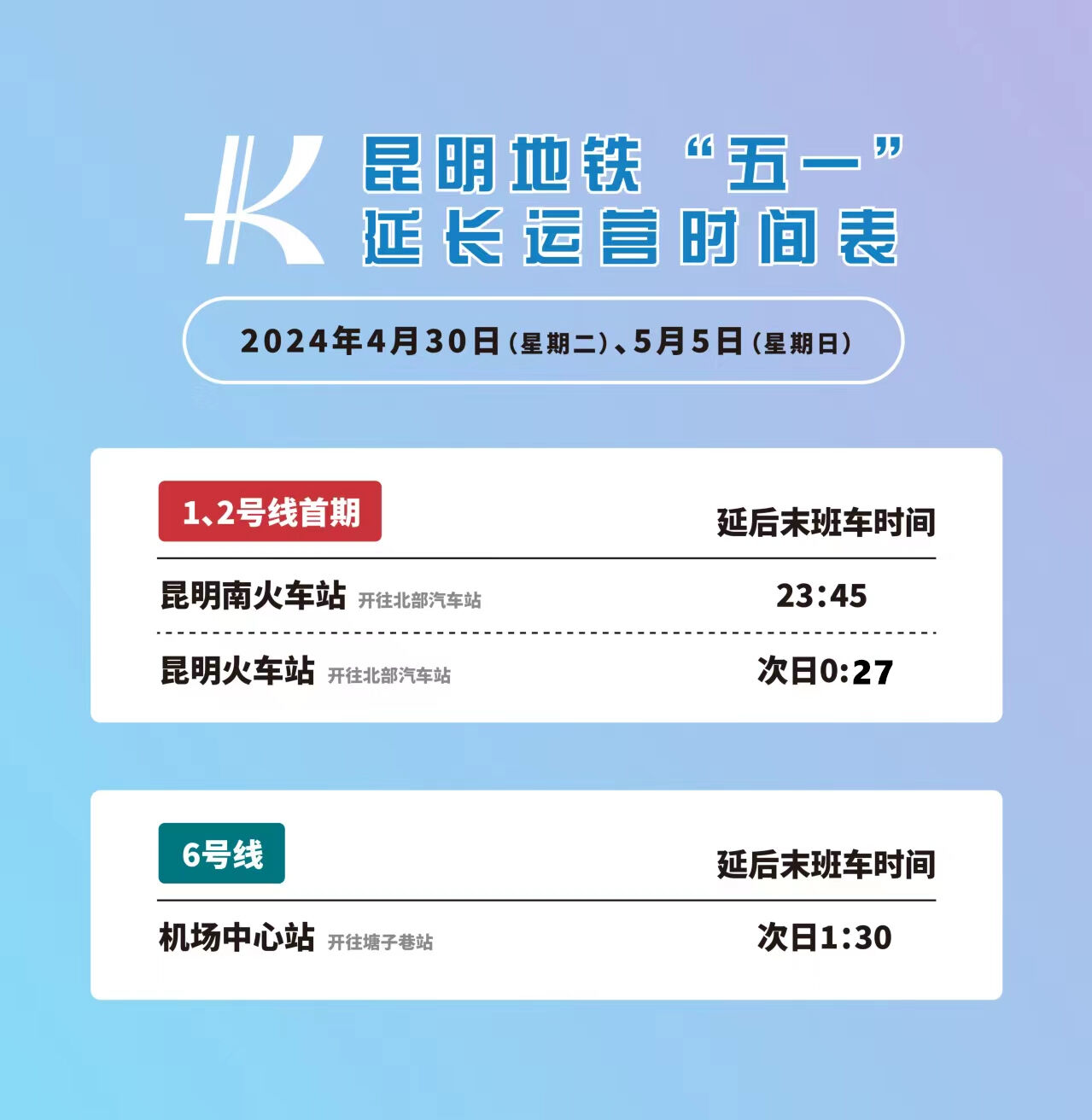 2024年勞動(dòng)節(jié)5月1日至5月5日放假。昆明地鐵制定專項(xiàng)保障方案,“五一”假期延長運(yùn)營時(shí)間,多條線路末班車延后至次日凌晨,讓廣大市民和抵昆旅客更加便利安全出行。