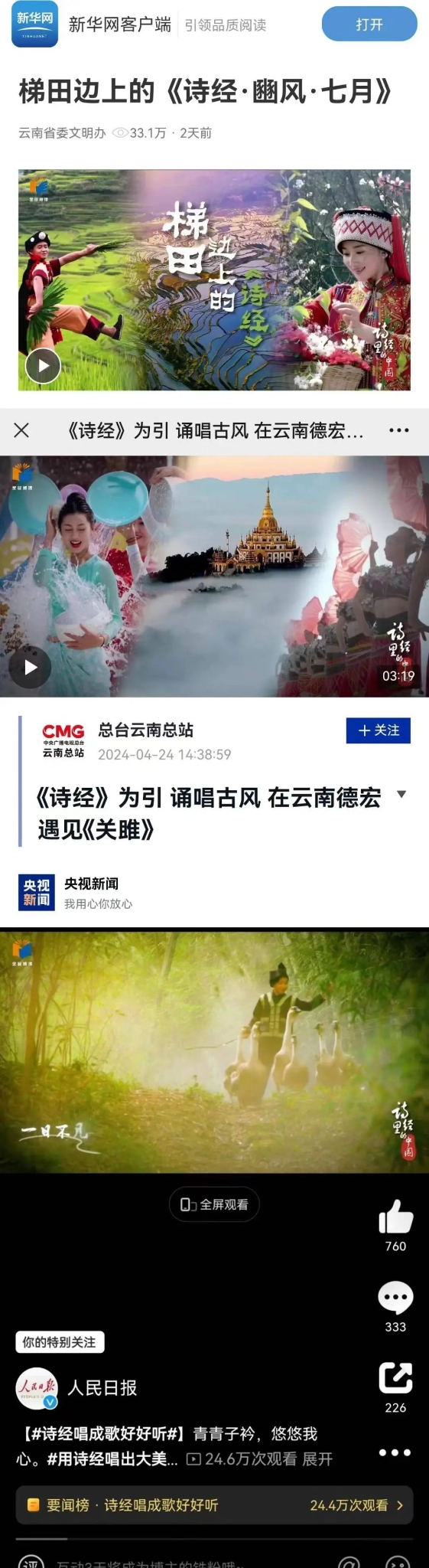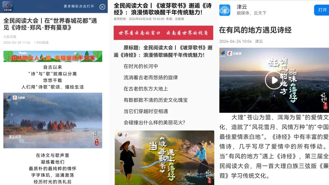 第三屆全民閱讀大會(huì)期間,由省委宣傳部、省委網(wǎng)信辦主辦,省委文明辦統(tǒng)籌、策劃,云新聞客戶端和昆明、玉溪、紅河、文山、大理、德宏六個(gè)州(市)黨委宣傳部承辦的“詩(shī)經(jīng)里的中國(guó)”誦讀演唱活動(dòng),將《詩(shī)經(jīng)》經(jīng)典名篇與“有一種叫云南的生活”IP相契合,與云南六座城市的文脈相融合,展示中華文化經(jīng)典之美、生態(tài)云南之美、民族團(tuán)結(jié)之美、城市發(fā)展之美。
