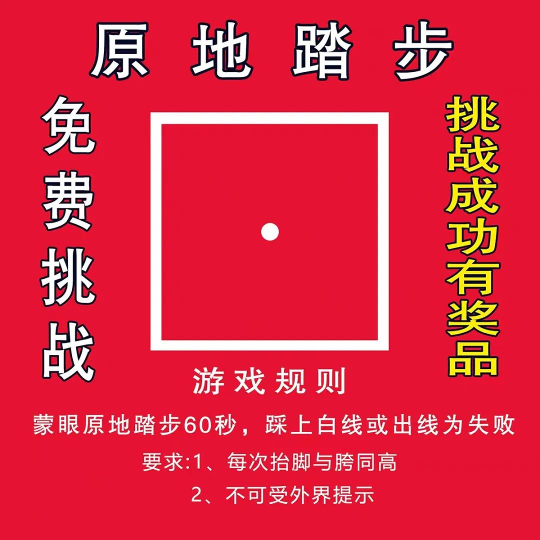 蒙眼踏步挑戰(zhàn):蒙眼原地踏步60秒,踩上白線或出線外為失敗,每次抬腳與胯同高,不可受外界提示,如有違反,成績不算。我們將在室外籃球場舉辦這一活動,每人免費參與一次,挑戰(zhàn)成功者可領取我們?yōu)槟臏蕚涞男《Y物。