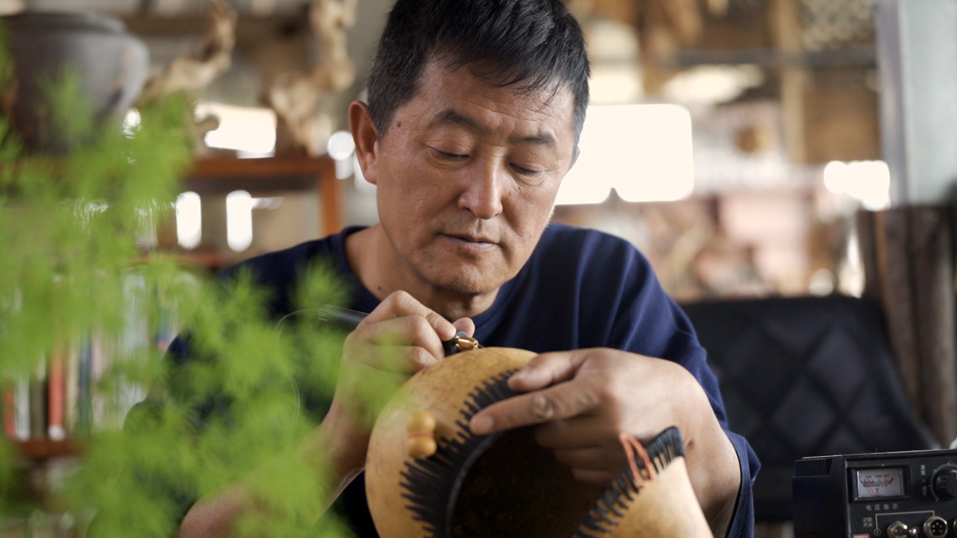 葫蘆雕繪是一種以葫蘆為載體,用雕刻、火繪等手法制作手工藝品的技術(shù),它賦予了葫蘆新的生命與文化內(nèi)涵,葫蘆的雕繪圖案有山水、鳥獸、人物、字體等,山水煙霧繚繞,鳥獸栩栩如生,人物形態(tài)各異,富有美好的寓意。到今年,徐孝國已經(jīng)在葫蘆雕刻非遺傳承“深耕”22年了,除了給葫蘆雕刻、繪畫上精美圖案,他還不斷創(chuàng)新開發(fā)出富有自己特色的葫蘆吉他、葫蘆馬頭琴、葫蘆酒瓶等,作品極具特色深受國內(nèi)外消費者的喜愛。