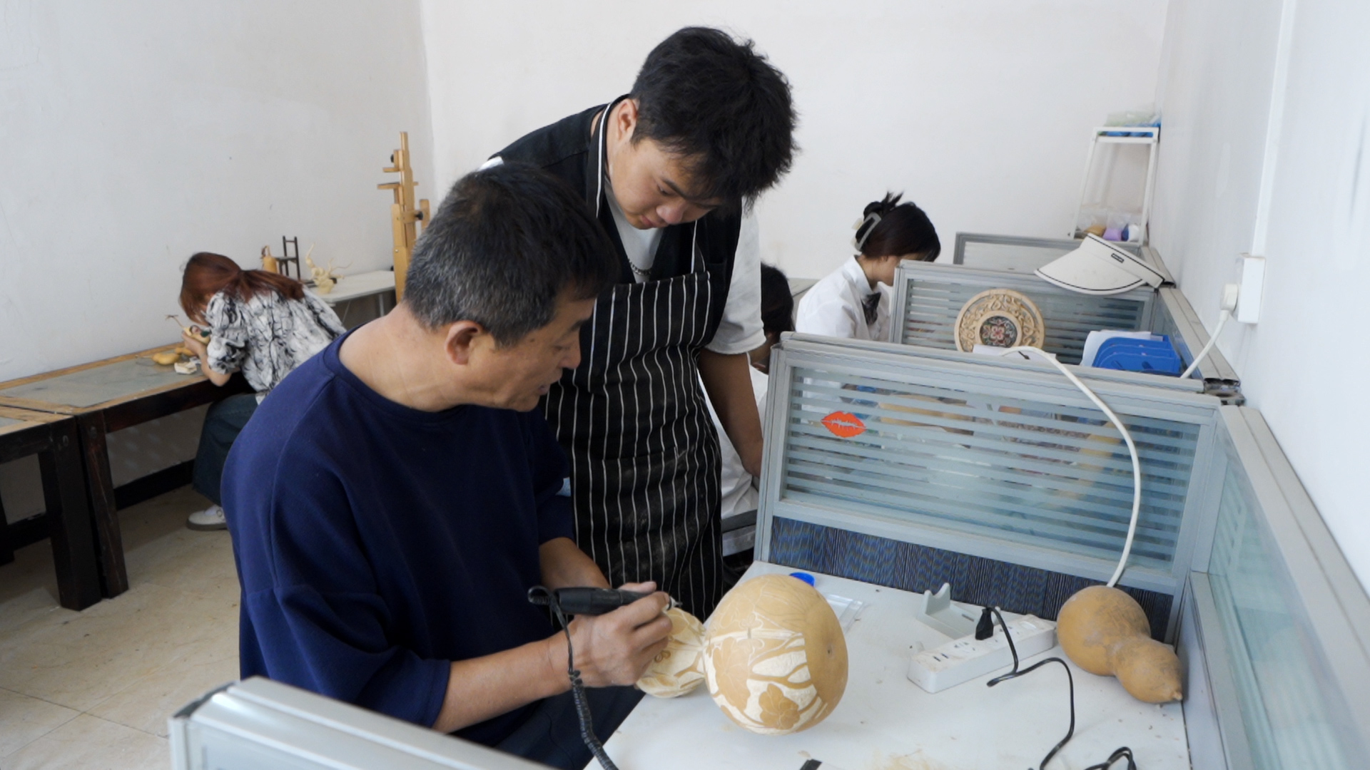 為了將非物質(zhì)文化葫蘆雕繪傳承下去,徐孝國在多所學校開設以傳承葫蘆雕刻技藝為主的工藝美術(shù)課程,把非物質(zhì)文化遺產(chǎn)的知識和項目技藝引入學校課堂教學計劃,此外,還有不少學生到傳習館學習。徐孝國在平時的教學中,注重與年輕人進行思維碰撞擦出創(chuàng)新的火花,合作出更多新的葫蘆作品。