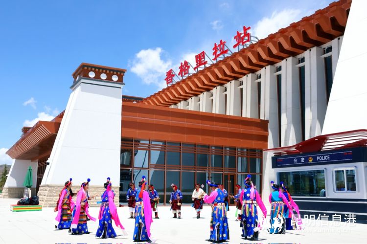 “五一”小長(zhǎng)假,香格里拉站出站口,當(dāng)?shù)孛癖娚碇褡迨⒀b載歌載舞歡迎游客的到來(lái) 通訊員朱萬(wàn)祥 攝