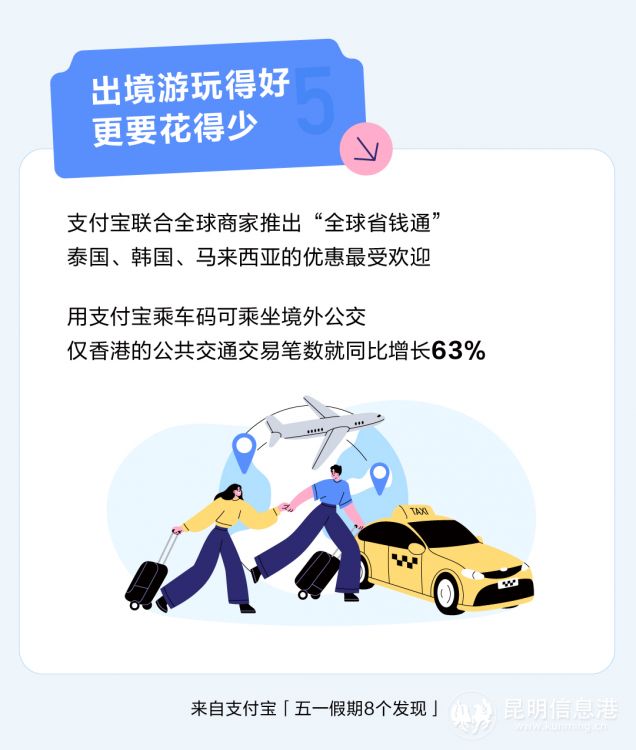 用支付寶乘車碼乘坐當?shù)毓?,也成為出境游的新方式。香港和澳門能刷支付寶坐公交,既劃算也更低碳,僅香港的公共交通交易筆數(shù)就同比增長63%。