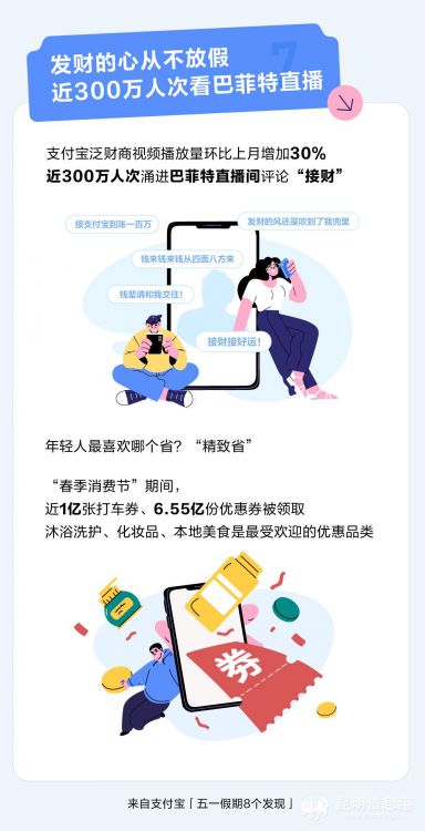 想發(fā)財?shù)男囊矝]有放假:五一期間,支付寶泛財商視頻播放量環(huán)比上月增加30%,一夜之間更有近300萬人次涌進巴菲特直播間評論“接財”。