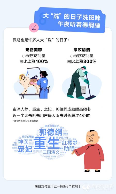 在放假這種“大洗”的日子里,也有很多人選擇回歸生活,專注悅己。寵物服務(wù)頭部小程序訪問量同比增長超100%,家政清潔維修頭部小程序訪問量同比增長超300%,洗衣、洗被、洗狗子,洗去班味。近一半讀書聽書用戶每天聽書時長超過4小時,五大書名高頻詞分別是:助眠、重生、神醫(yī)、寵妃、郭德綱。四大名著中《紅樓夢》和《三國演義》也在前列。(昆明信息港 記者昝娟娟)