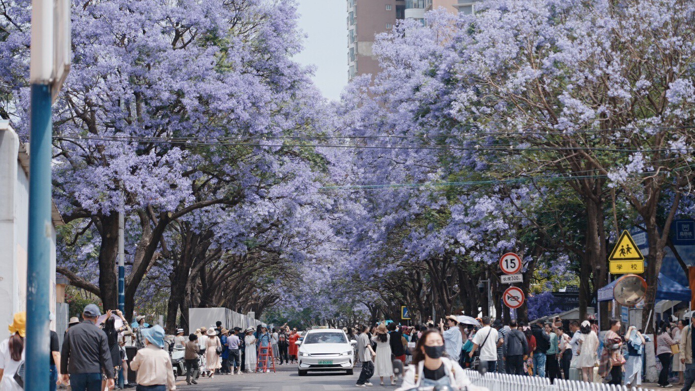 五一假期,云南昆明,盛開的藍(lán)花楹成了人氣“頂流”。