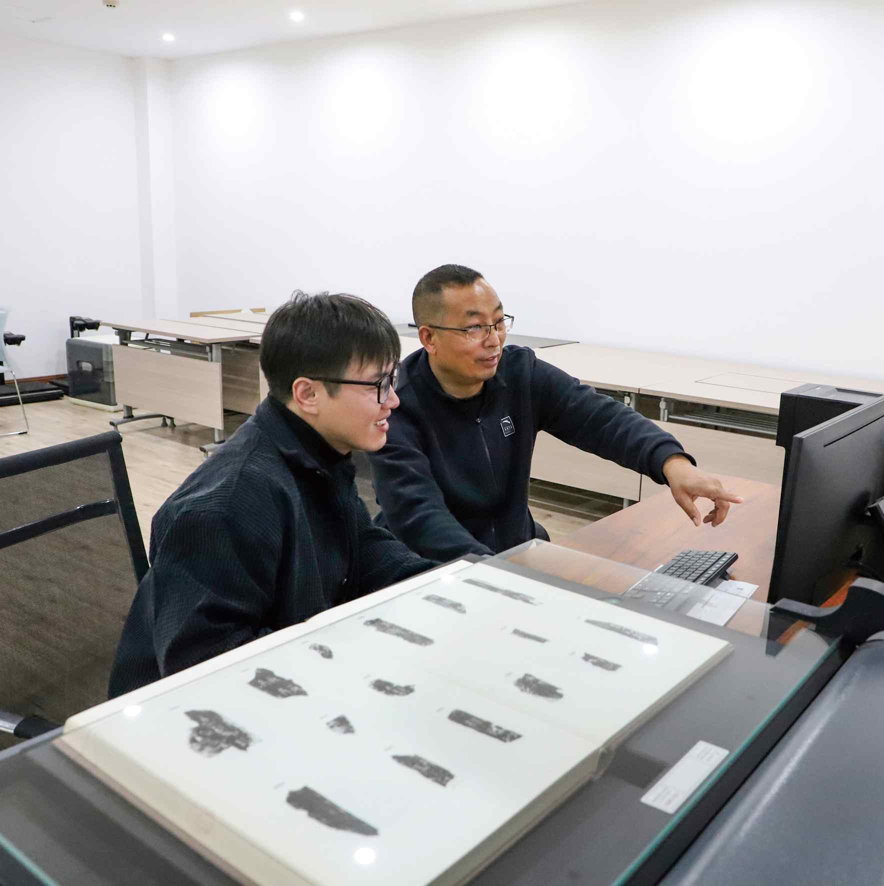 ▲ 劉永革(右)與學(xué)生研究甲骨文 張愛善 攝